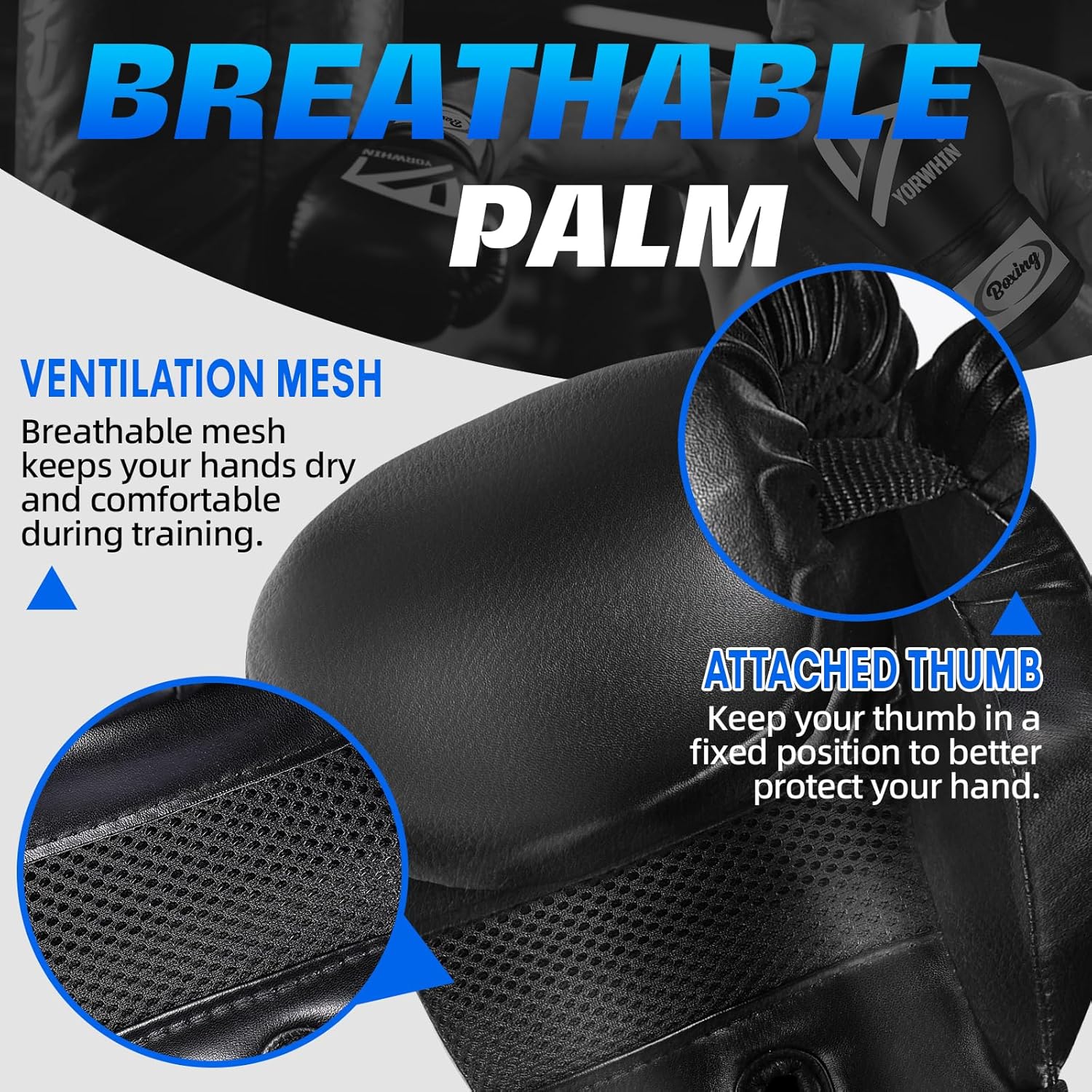 - HIGH QUALITY AND BREATHABLE:Bid farewell to those sweaty palms and hands. With multiple ventilation holes strategically placed in the thumb sections of the lightweight boxing gloves, airflow management so that its customers get a sweat-free experience. Furthermore, the advanced perforated sheet for breathable ventilation in the palm area is sweat-wicking and minimizes sweat accumulation.
